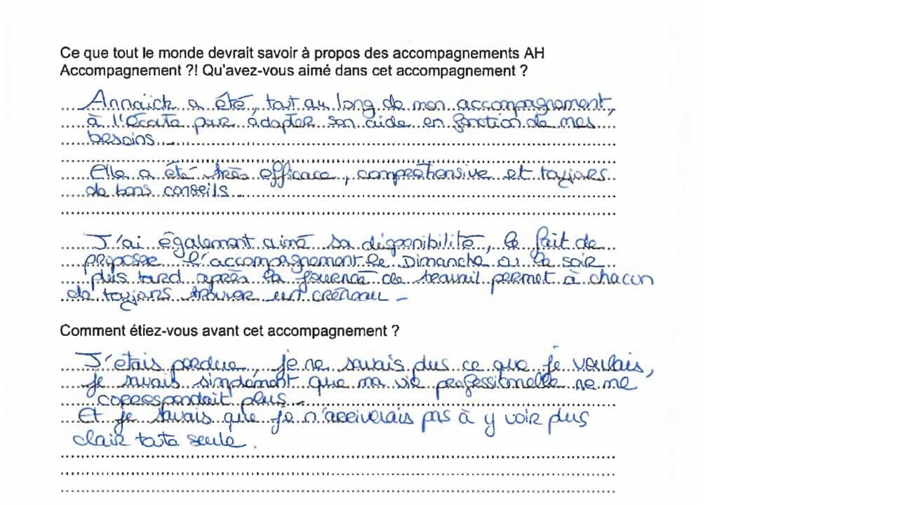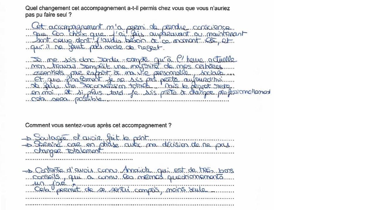 Pour certains, j’ajoute le témoignage sur FB ou plus récemment Google mais beaucoup de personnes sont encore en poste quand elles finissent les accompagnements et je conserve donc au début l’anonymat !